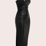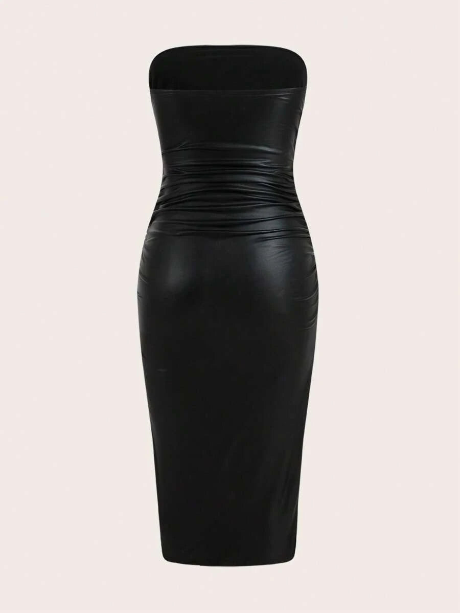 Thigh-Slit PU Leather Bandeau Bodycon Long Dress